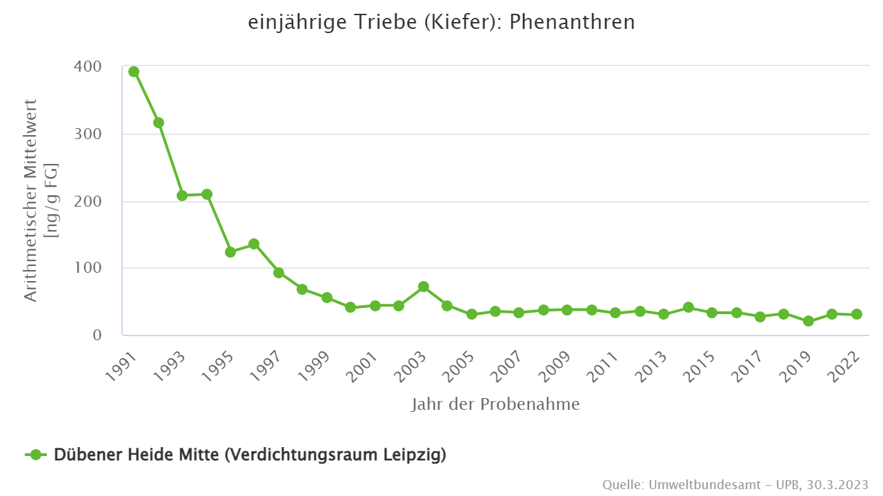 Anfang der 1990er Jahre fanden sich hohe Konzentrationen von Phenanthren in Kieferntrieben aus der Dübener Heide. In den Folgejahren ging die Belastung signifikant zurück. Dies dürfte in erster Linie auf verbesserte Emissionsschutzmaßnahmen und auf Betriebsstilllegungen in der benachbarten Industrieregion Bitterfeld zurückzuführen sein. Auch verminderte Emissionen aus häuslichen Heizungsanlagen könnten zu dem beobachteten Belastungsrückgang beigetragen haben.