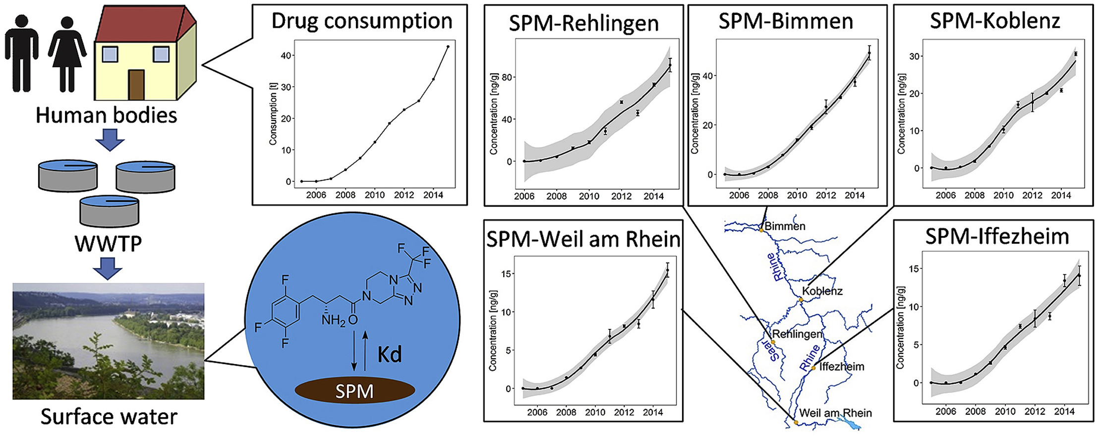 Although several studies confirmed a wide distribution of pharmaceuticals in rivers and streams, a limited knowledge is available about the partitioning of pharmaceuticals between the water phase and suspended particulate matter (SPM). To close this gap of knowledge, we developed and validated a sensitive and high throughput analytical method for the analysis of 57 pharmaceuticals, 42 metabolites and transformation products (TP) as well as the artificial sweetener acesulfame sorbed to SPM. The method was based on pressurized liquid extraction (PLE) followed by a clean-up via solvent exchange and detection via direct injection-reversed phase LC-MS/MS and freeze-drying-HILIC-MS/MS. Freundlich isotherms were determined for 90 analytes. All showed a linear sorption behavior. Distribution coefficients (Kd) ranged from 0.64 L/kg to 9300 L/kg. For 18 pharmaceuticals, Kd values were found to be above 100 L/kg. SPM of annual composite samples were analyzed to determine the pharmaceutical concentrations between 2005 and 2015 at four sites of the river Rhine: Weil, Iffezheim, Koblenz and Bimmen as well as between 2006 and 2015 at one site of the river Saar, at Rehlingen. In these SPM samples, up to 61 of the 100 analytes were detected with concentrations up to 190 ng/g d.w. (dry weight) for guanylurea, a transformation product of the antidiabetic metformin. For most analytes, increasing concentrations were found along the length of the Rhine and higher concentrations were measured in Rehlingen/Saar. Normalization of the data with the antiepileptic drug carbamazepine as an intrinsic tracer for municipal wastewater indicated possible industrial discharges for four analytes. For most pharmaceuticals, the annual concentrations exhibited a good correlation with the consumption volumes in Germany.