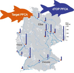 The dTOP assay revealed that considerable amounts of precursors were present at most riverine sampling sites. Particularly high precursor concentrations were observed in samples from the Upper Elbe at the Czech border and the Upper and Middle Rhine. In herring gull eggs and most soil samples, though, concentrations of precursors were low. Time trend analysis showed decreasing trends for most detected PFAS since 2005. In SPM, however, C4-C6 perfluoroalkyl carboxylic acids seem to increase indicating growing use of precursors based on shorter fluorinated chains.