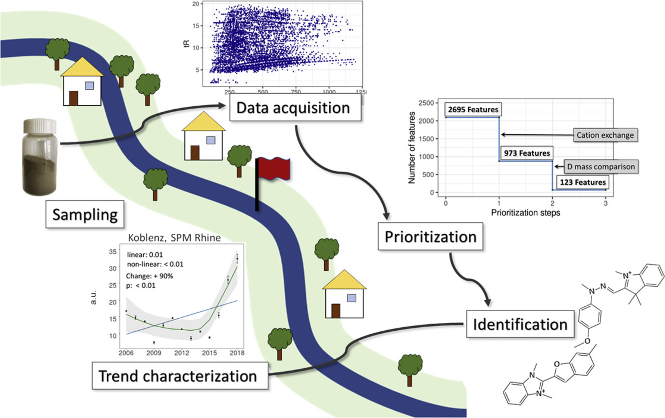 By applying both methods in a combined approach, 123 of the initially detected 2695 features were prioritized, corresponding to a 95% data reduction. This led to the identification of 22 permanent cationic species. The organic dyes Basic Yellow 28 and Fluorescent Brightener 363 as well as two quaternary ammonium compounds (QACs) were detected in environmental samples for the first time to best of or knowledge. The other compounds include additional QACs, as well as quaternary tri-phenylphosphonium compounds (QPC/TPP). In addition to identification, we determined temporal trends of all compounds over a period of 13 years and assessed their ecotoxicological relevance based on estimated concentrations. The two QACs oleyltrimethylammonium and eicosyltrimethylammonium show significant increasing trends in the Rhine SPM and maximum concentrations in the Saar SPM of about 900 and 1400 µg/kg, respectively. In the case of the dyes, constant trends have been observed at the end of the studied period, but also maximum concentrations of 400 µg/kg for Basic Yellow 28 in 2006 and 1000 µg/kg for Fluorescent Brightener 363 in 2015, potentially indicating a strong ecotoxicological risk.