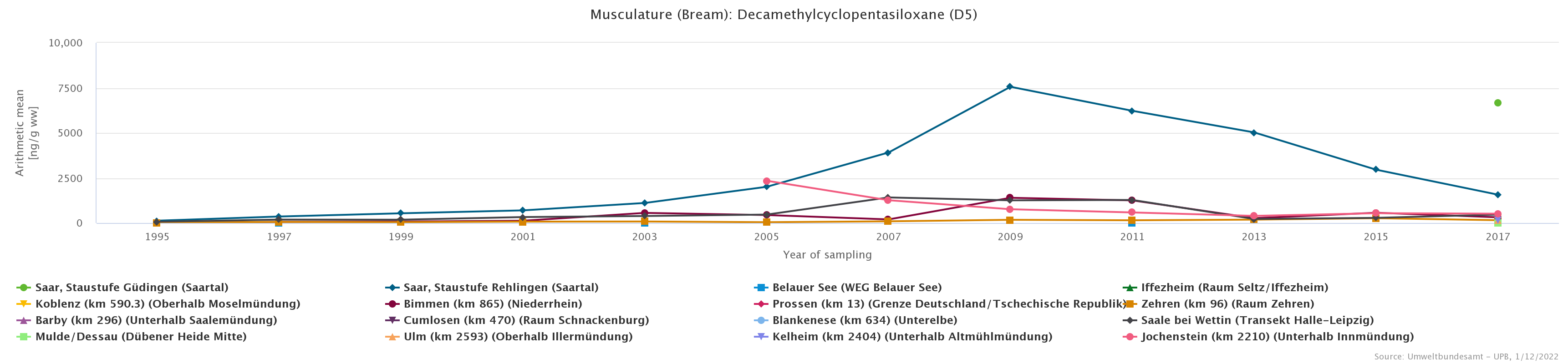 In fish from all sampling sites and over the entire study period, the decamethylcyclopentasiloxane (D5) concentrations were significantly higher than the measured D4 and D6 concentrations. The Saar samples (near the German-French border) were the ones most contaminated with cVMS. Elsewhere, cVMS occurred in high concentrations especially at those sampling sites where industrial plants producing or processing cyclic methylsiloxanes are known in the river basin. This applies to the sampling sites in the Elbe near Dresden, Wettin in the Saale and Jochenstein in the Danube.